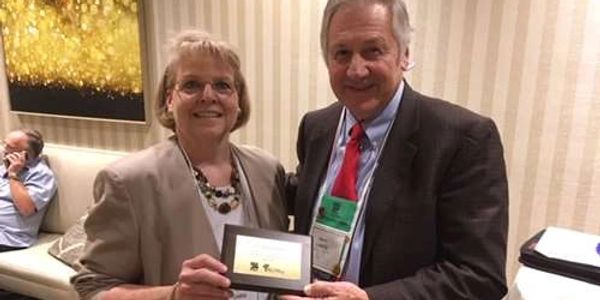 Carol Parker is recognized for teaching on guest services at the National Auction Conference and Show by President Lance Walker.